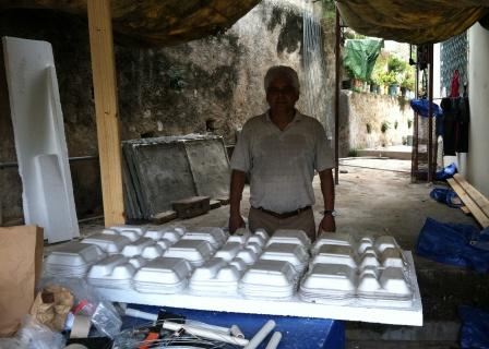 Currently these EPS ( expanded polystyrene) lunch (takeout)boxes are burnt, considered trash, causing an irreversible ecological damage, ozone depletion and contribute adversely to global warming. The above picture is typical how the lunch boxes are burned and disposed off. The building has thatch roof, sprayed with a fire retardant, and has an average heat resistance value of R-30. The thatch is also occasionally treated as waste material and burnt as well.