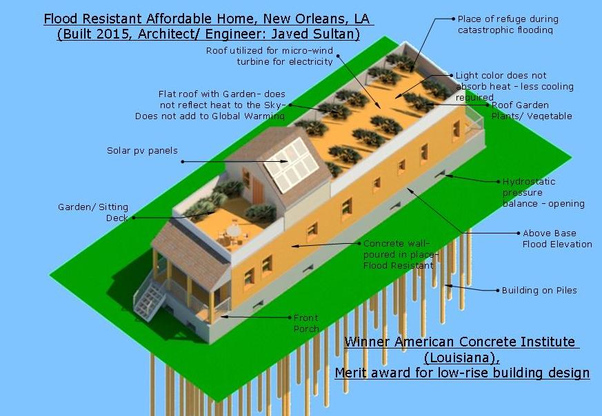 Javed Sultan, our chief architect and engineer, designed and built a similar affordable single story flood resistant structure for the city of New Orleans in 2015. In 2017, the home won American Concrete Institute's (Louisiana Chapter) merit award for low rise home design. It was built in a previously flood impacted economically distressed area. It is similarly well insulated (Equalling or exceeding building code requirements: R-24 for walls, R-30 for roof, and R-19 for Floor), utilizes similar sandwiched insulation, re-usable formwork, poured-in-place concrete wall technique (no mortar joints - prevents infiltration of air or flood waters). Can be mass produced or manual labor driven. It uses less cement than conventional masonry structures. The two bedroom home, elevated above the base flood elevation, has a "Green" flat garden roof in lieu of gabled roof, the current practice in New Orleans, which reflects heat to the sky and contributes to global warming. The building requires very little supplemental cooling (air-conditioning) in summer months. (Since this work was done for a third party (not a SARID project), pictures of the completed building will be posted at a future date on a third party website)